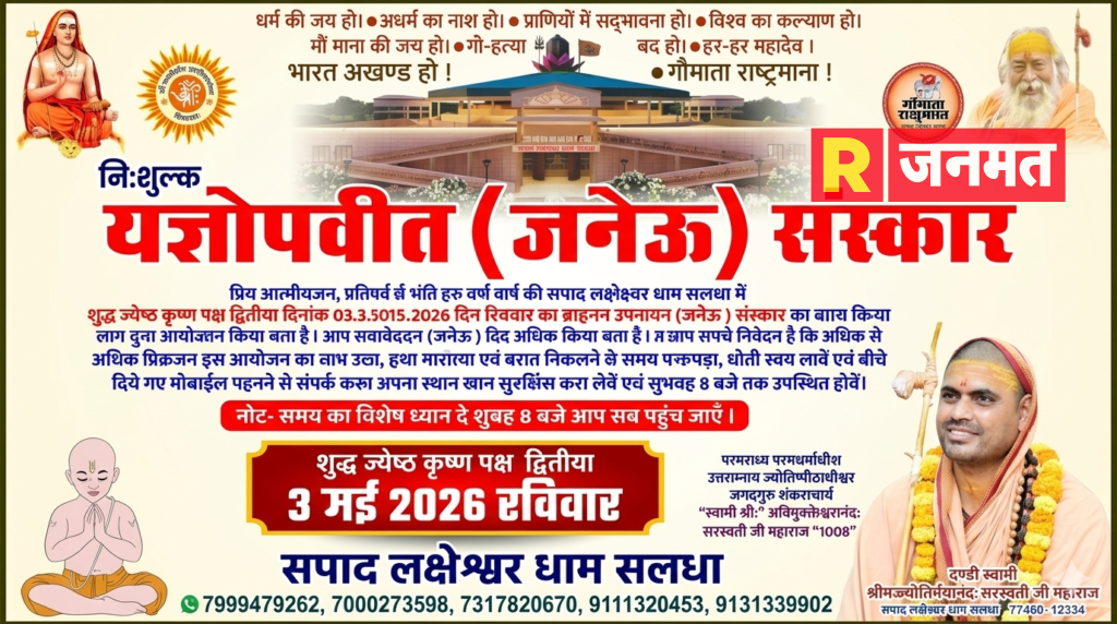 बेमेतरा/सलधा: क्षेत्र के प्रसिद्ध धार्मिक स्थल सपाद लक्षेश्वर धाम, सलधा में प्रतिवर्ष की भांति इस वर्ष भी सामूहिक निःशुल्क यज्ञोपवीत (जनेऊ) संस्कार का भव्य आयोजन किया जा रहा है। यह आयोजन शुद्ध ज्येष्ठ कृष्ण पक्ष द्वितीया, रविवार दिनांक 03 मई 2026 को संपन्न होगा।